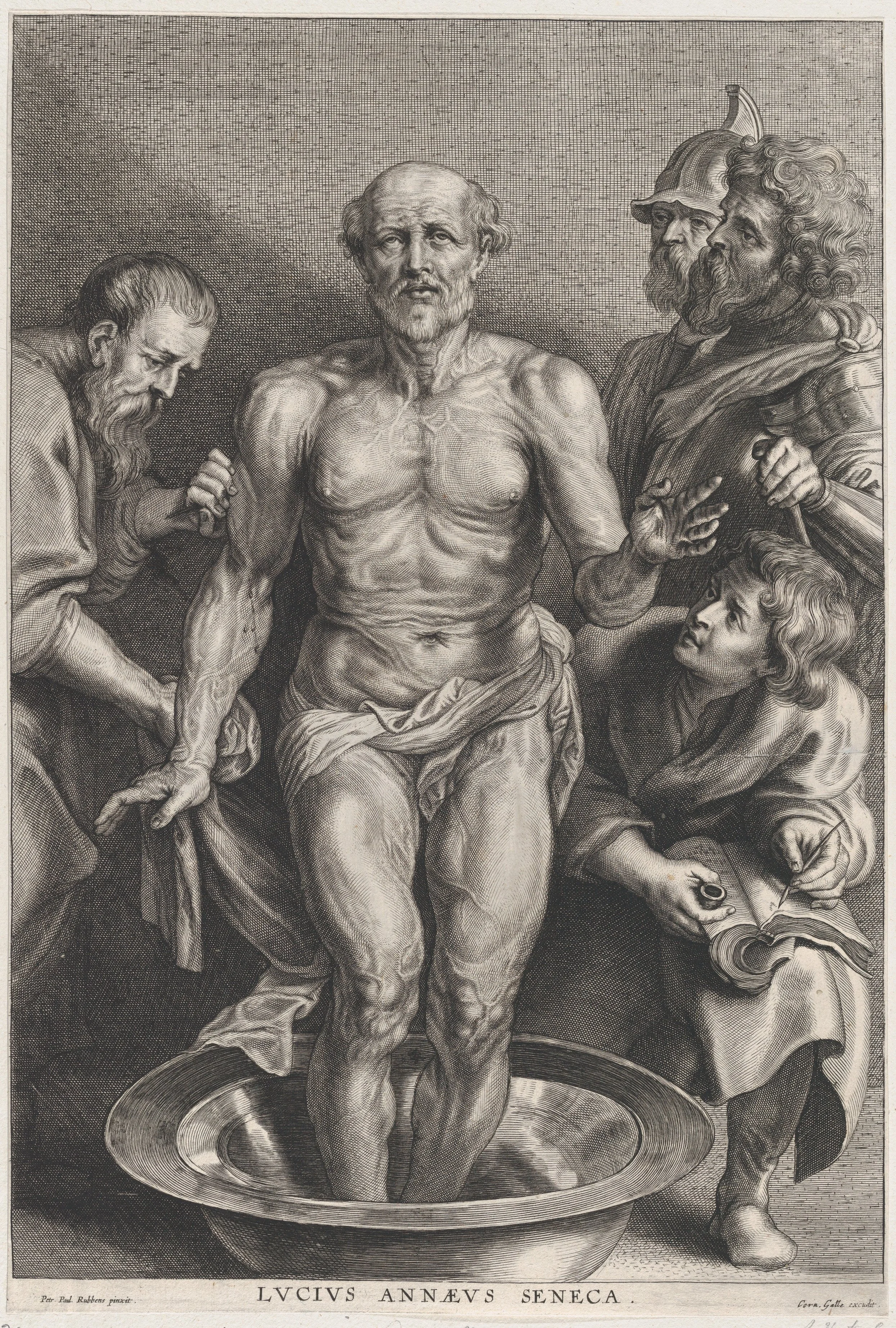 The Death of Seneca, standing at center with his feet in a basin of water, supported by a disciple at left while another takes down his last words at right. Artist: Alexander Voet II (Flemish, Antwerp ca. 1635–after 1695 Ghent)