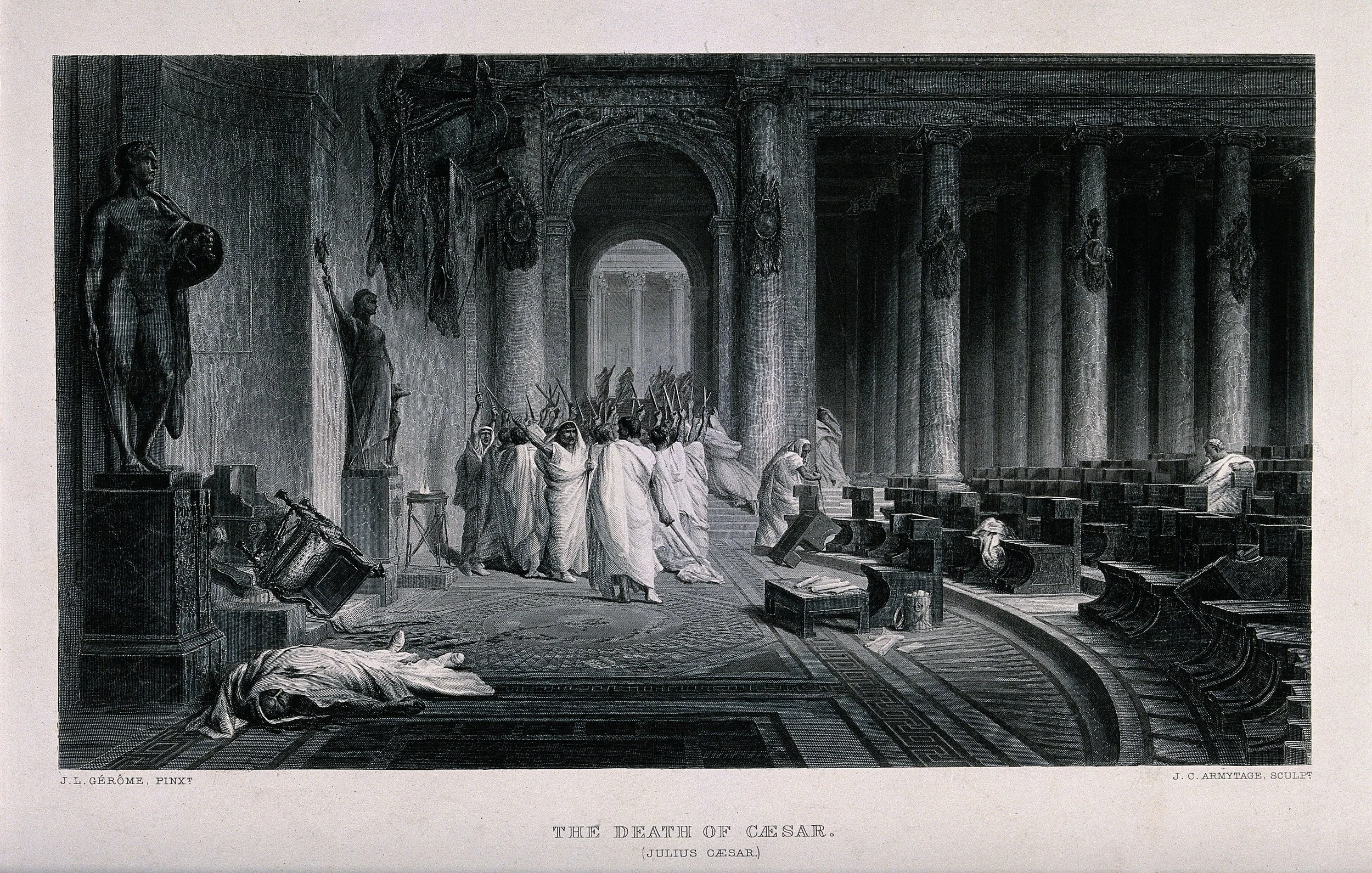 The death of Caesar: Caesar is lying on the ground, assassinated by a group of senatorial conspirators led by Cassius Longinus and Marcus Iunius Brutus on the Ides of March. Etching by J.C. Armytage after J.L. Gérome. Image courtesy of Wikimedia Commons.